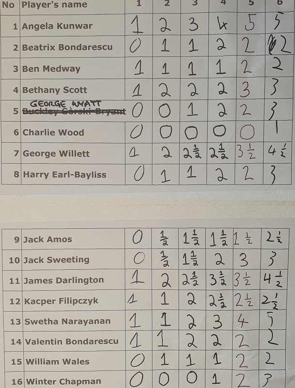 1st: Angela Kunwar 5/6*; 2nd: Swetha Narayanan 5/6 *; 3rd: James Darlington 4½/7 *; 4th George Willett 4½/7 *